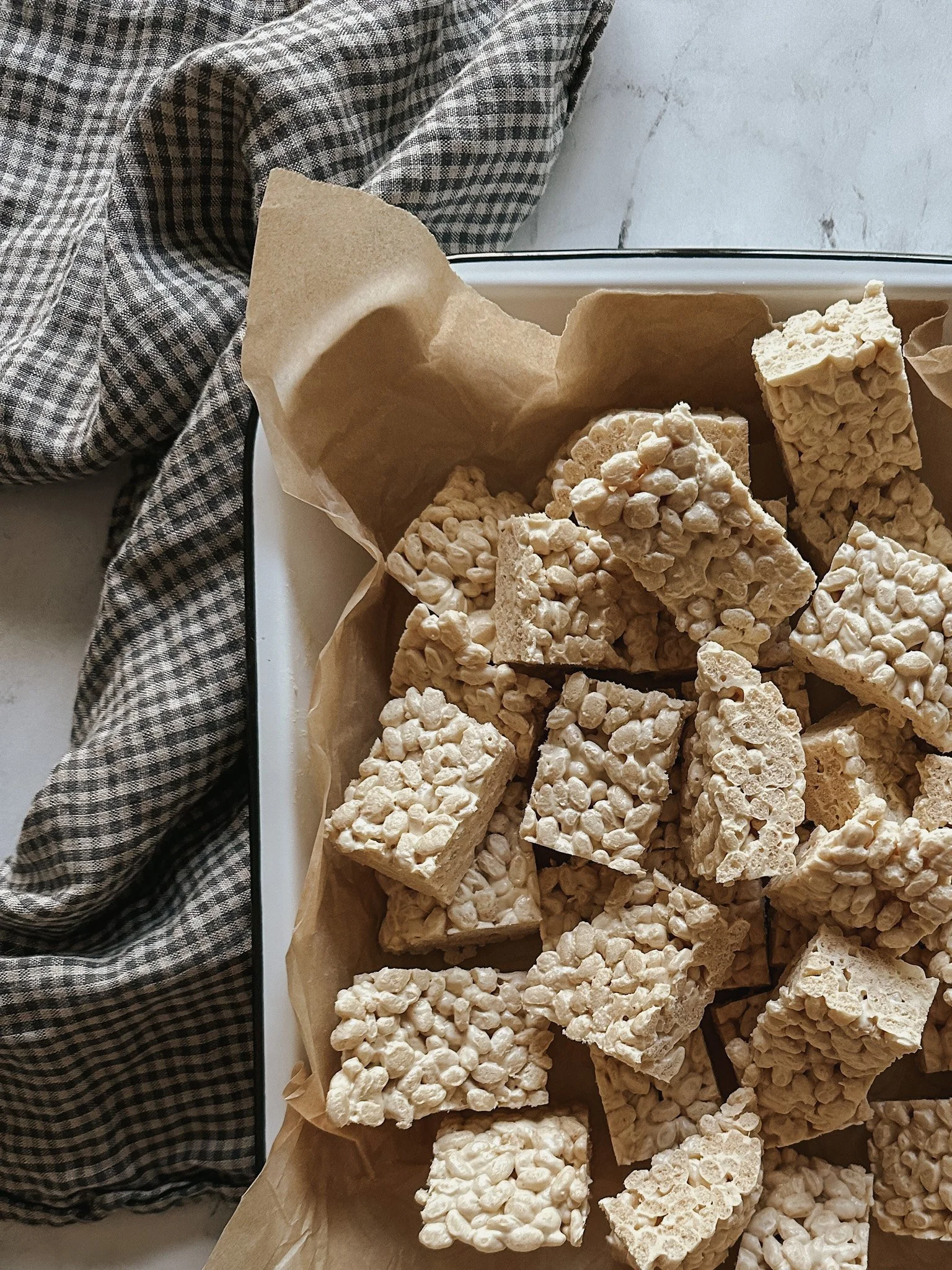 Let it incorporate a bit until it isn’t sloshing around too much. Turn the speed back to high and fully mix it in. Add the arrowroot in and mix for another minute. Turn the mixer off and remove the bowl from the stand mixer and quickly pour the cereal in. Use a rubber spatula to incorporate the crispies and then pour into the buttered dish and smooth out. Pop in the fridge to firm up. Slice into squares once it’s hardened. They seem to stay crisper if they’re stored in the fridge rather than at room temperature.