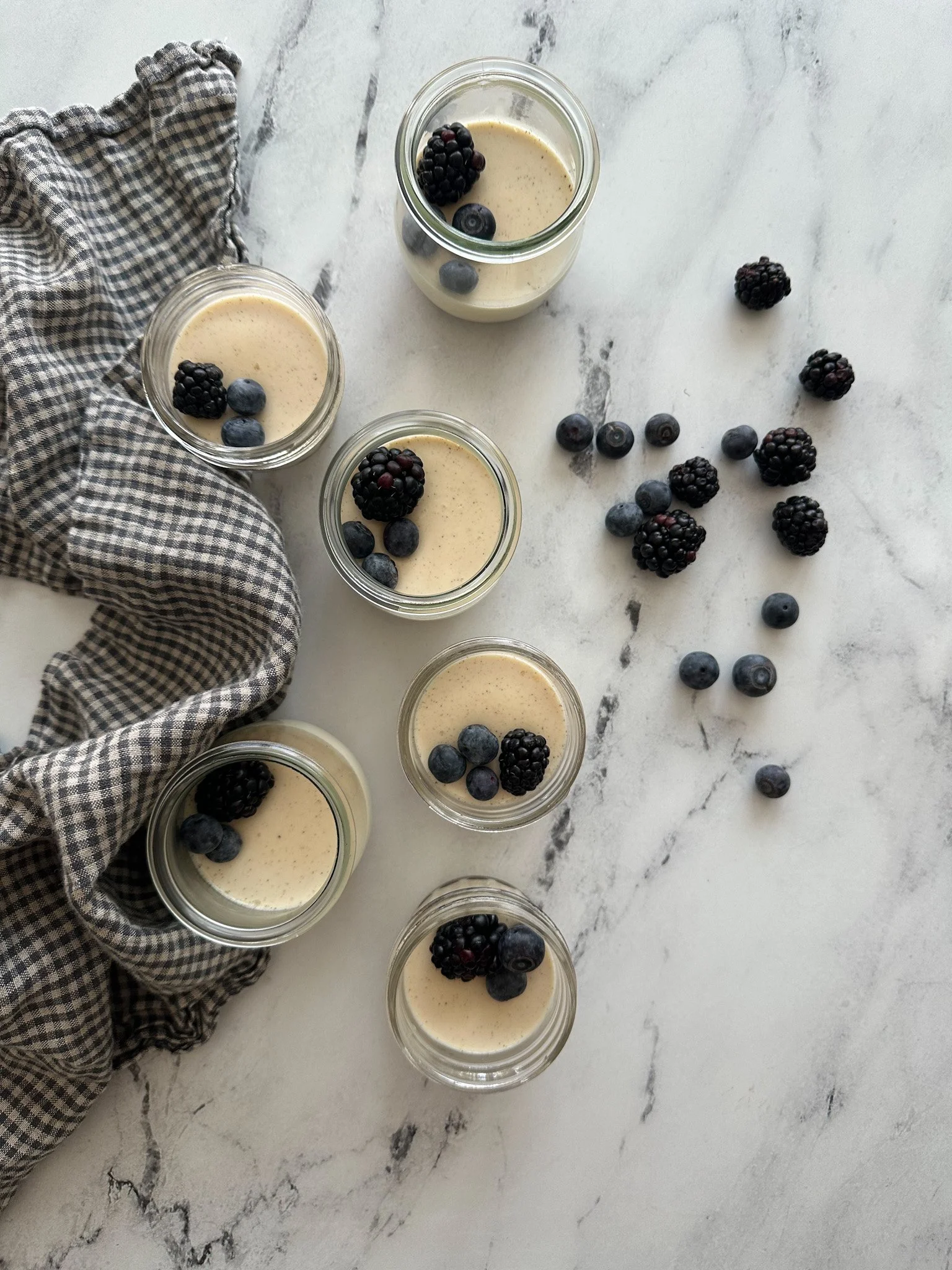 First, get a plate or dish that you can put your panna cotta cups on. I like to use any little jar I have handy, like little mason jars or weck cups. Set them on the plate ready to go in the fridge when your mixture is ready. In a small bowl filled with the 1/4 cup of milk, sprinkle the gelatin over top in an even layer. It will start to absorb the milk immediately, but will take a few minutes to fully bloom. In the meantime, grab a small pot and heat the cream over medium heat. You want it hot, but not boiling. Remove it from the heat and stir in the honey, lemon zest, and vanilla. Pour the gelatin-milk mixture in the pot. Use a whisk to fully incorporate. If you see undissolved gelatin, you can place it back over the heat and gently heat it again until dissolved. Just don’t let it boil. Pour the mixture into the prepared cups and place in the fridge. It will take about 4 hours to fully set! You can top these however you’d like. A crumbled graham cracker and some sliced strawberries would be lovely! You can store them covered in the fridge for about 5 days.