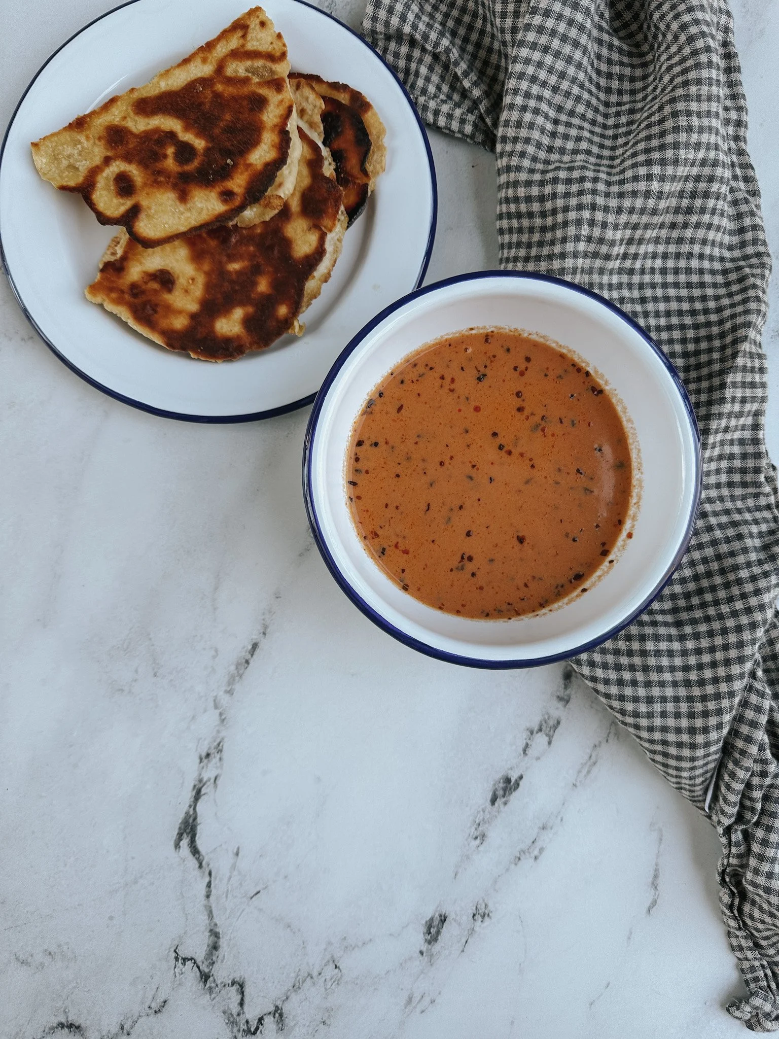 To make the naan grilled cheese while the soup is simmering, heat a wide skillet over medium low heat. Melt the butter and place a naan in the pan. Top with grated cheese and press another naan of similar size and shape on top. Some cheese will most definitely spill out and crisp up on the edge of the grilled cheese which is pretty much the best bite! Cook until golden on that side and flip to cook on the other side. Cut in wedges and dip to your heart’s content!