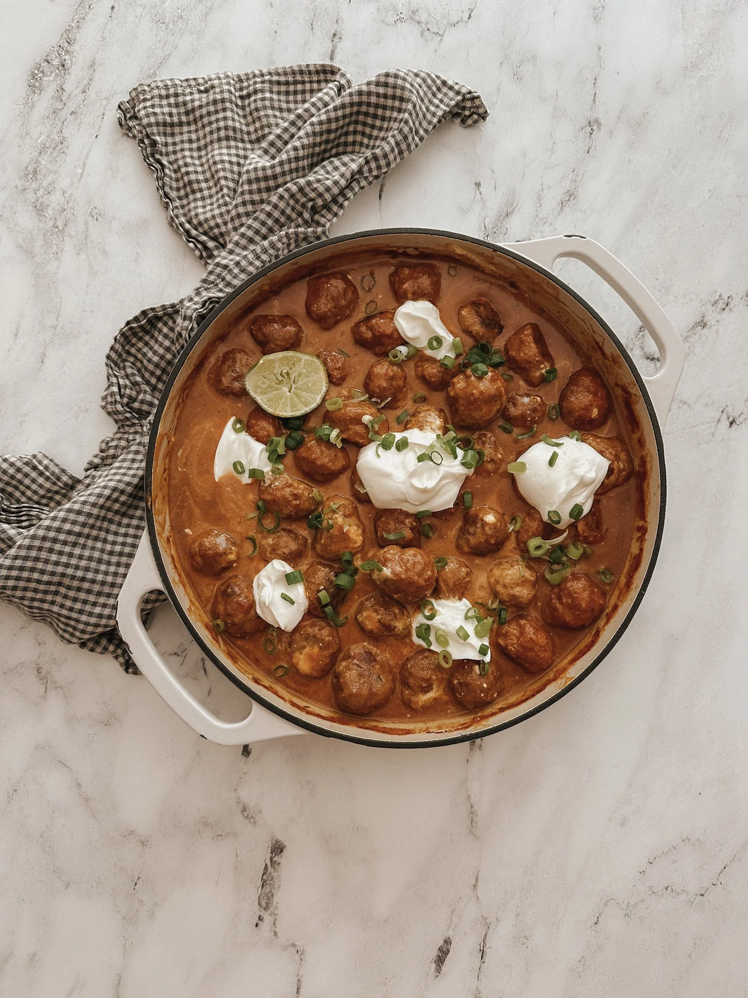 I’m not ashamed to admit that we’ve eaten this meal no less than 5 times in the last 3 weeks. After I tested the recipe I found myself craving it every week and just had to put it in the meal plan again! The meatballs are crazy tender, the sauce is just so silky and cozy, sweet and savory in the best way. The flavors are perfect for fall and it’s really one of those meals that feels so luxurious, but is truly packed with nutrition. I can see many more appearances of this in my kitchen over the next few months! Don’t be afraid to play around with spice levels and add a bit more if you feel like your family can handle it. We usually keep it moderately spicy, enough to keep it interesting for the adults and tame enough for the kids. They like their meatballs served on rice with a dollop of yogurt, hold the sauce. I’m all about that simmer sauce and I drown my meatballs and rice in it!