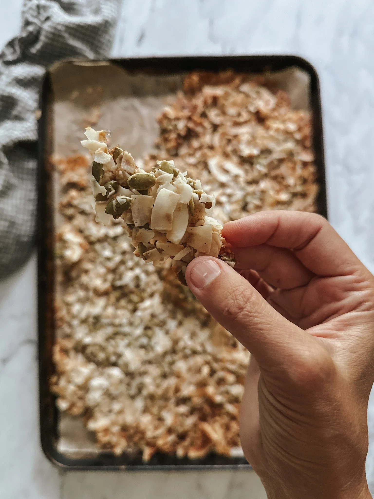 Preheat the oven to 300 degrees F. In a large bowl mix all of the ingredients together. Line a baking sheet with parchment and pour the mixture into an even layer on top. Bake for about 20 minutes. The edges should be golden, but the middle will be just slightly browning. You don’t want to burn the edges, but you do want to make sure the middle is dry enough. Let it cool completely on the baking sheet and break it into pieces. Store in an airtight container at room temp for a few days or up to two weeks in the fridge!