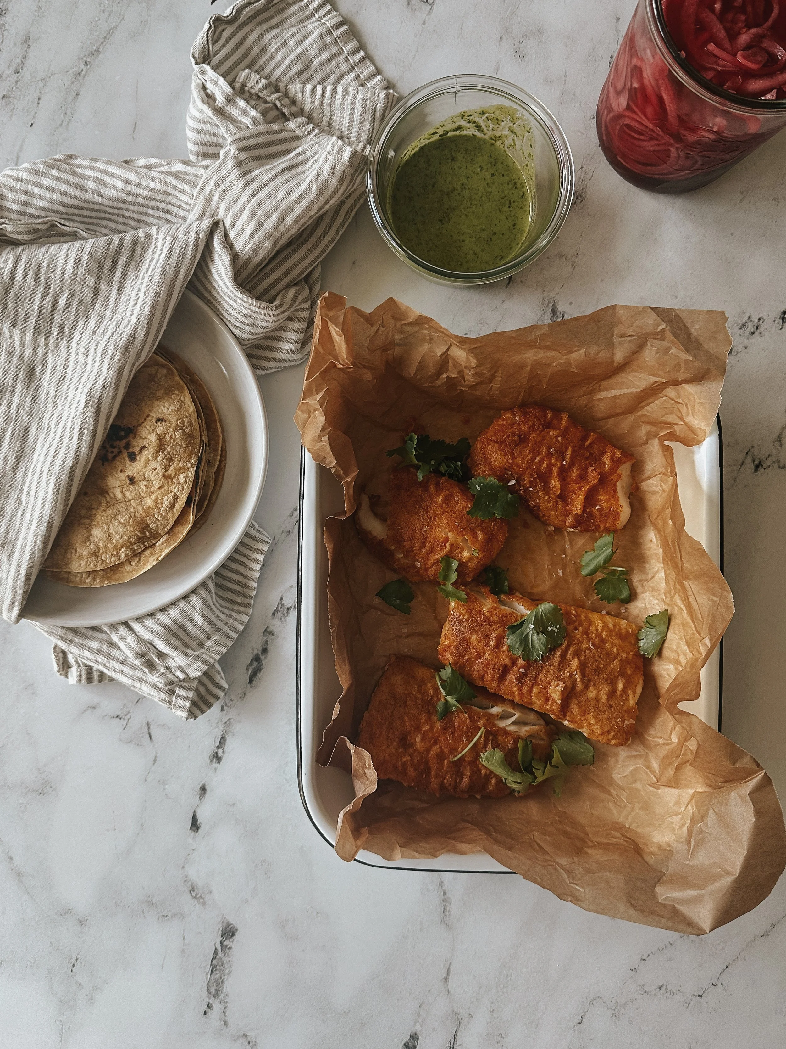 I’ve actually never eaten fish tacos on “vacation”, probably because I grew up on the Gulf Coast of Florida. But i’ve had my fair share. Now that we are landlocked and the proud dwellers of the Tennessee mountains, I see why fish tacos are synonymous with beach vacations in the winter! Luckily, you don’t need to hop on a plane to get them although that’s not a bad idea either. While you wait for your flight, you can whip these up in less than 20 minutes. That seems like a win-win to me.