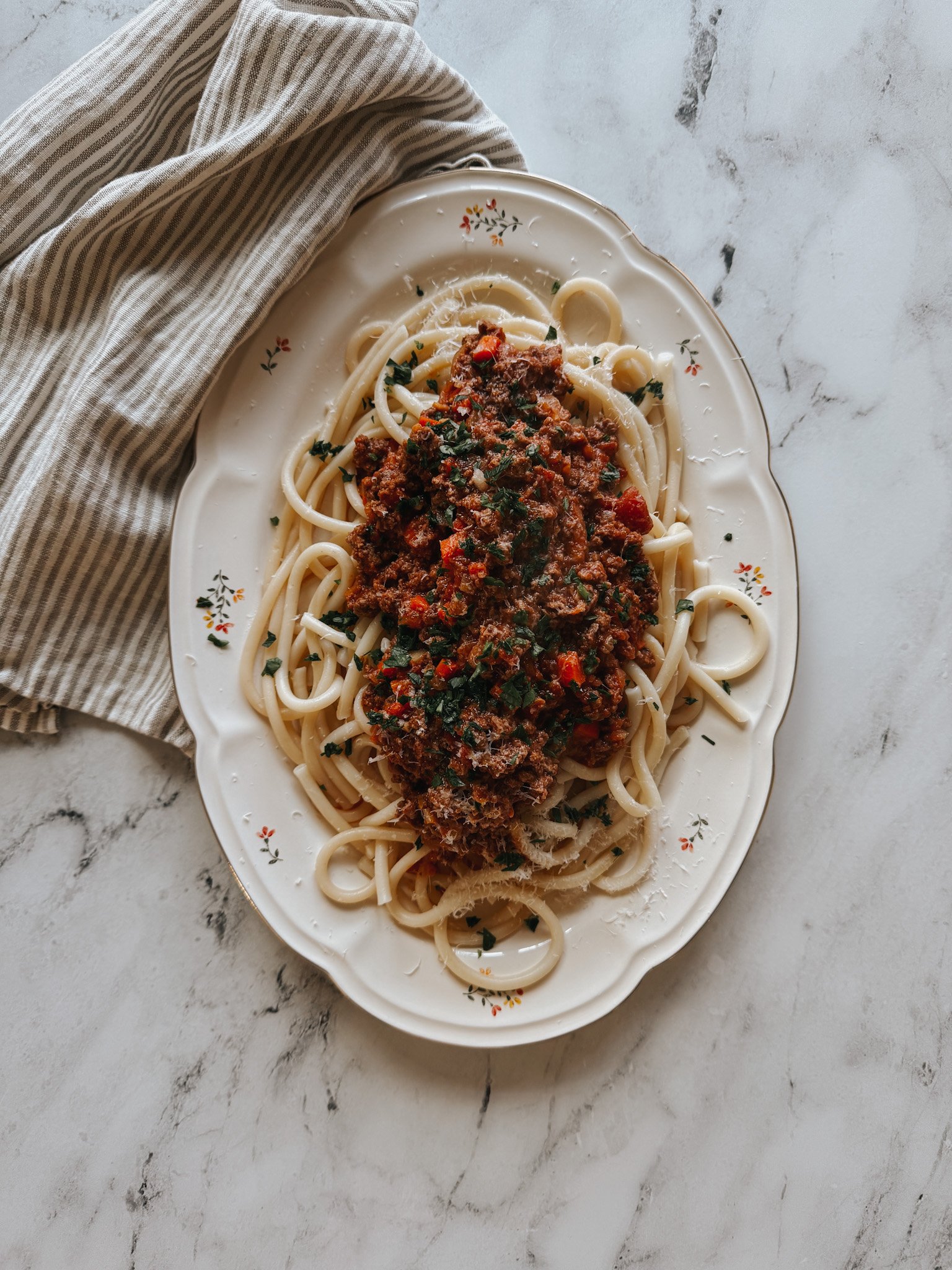 Did anyone else grow up with a weekly dinner rotation? My favorite night was always spaghetti and meat sauce night served with a loaf of sliced sandwich bread and country crock “butter.” I think I mostly filled up on the thickly buttered slices of bread which I used to scoop all of the leftover sauce from my plate. Man, how I loved those nights! We don’t have a weekly rotation of meals and only have a few recipes that we repeat year round (occupational hazard!), but a hearty bolognese is just the type of winter meal that I could eat week after week during these cold, dusky evenings. All of my research on Italian cuisine shows that “Sunday sauce” is often simmered for hours upon hours and requires much tasting and tweaking. A weeknight bolognese is more up my alley. It’s nothing more than some sautéed veggies with browned ground beef simmered for 30 minutes in a jarred marinara that already has that slow simmered taste.