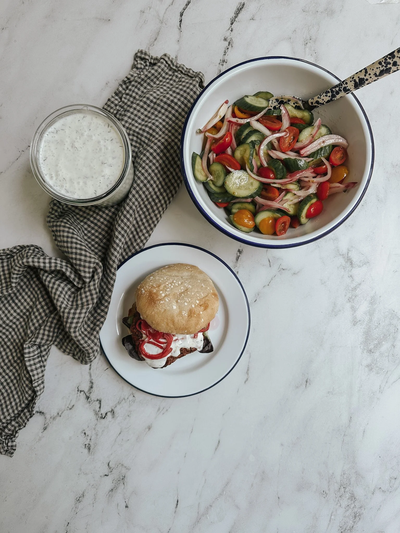 In a large bowl, combine all of the ingredients for the greek salad and toss to coat with the dressing. Set it aside to let the flavors mingle for about 15 minutes. This stores well in the fridge for up to 3 days!